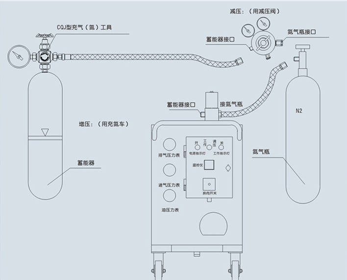 CQJ系列蓄能器充氮工具是蓄能器進(jìn)行充氣、補(bǔ)氣、修正氣壓和檢查充氣壓力等必不可少的專用工具。它具有結(jié)構(gòu)緊湊、安全可靠、承高壓、耐沖擊、使用方便等特點(diǎn)。